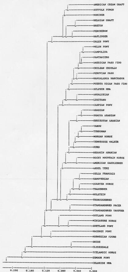 Gene frequencies for biochemical loci were calculated by direct count. Frequencies of alleles at blood group loci were calculated by the allocation method (Andersson, 1985). Genetic variation was measured as observed heterozygosity (Ho), Hardy-Weinberg expected heterozygosity (He), unbiased expected heterozygosity (Hu; Nei, 1978), effective number of alleles (Ae), and the total number of variants found in each population (Na). Ho was calculated for biochemical loci only because of the presence of recessive alleles and/or ambiguous genotypes at blood group loci. Therefore, for direct comparison, He and Hu were calculated for biochemical loci only (in an ideal population He (Hu) should equal Ho), for blood group loci, and for all 17 loci. In addition, population inbreeding level was estimated by Write's Fis=1-(Ho/He). Values of genetic variation of the Sulphur and Chloride herds were compared to those of 99 domestic horse populations that have been tested at the University of Kentucky. Genetic relationship of the Sulphur and Chloride horses to these other domestic breeds were investigated using Rogers' (1972) genetic similarity coefficient (S) and Nei's modified genetic distance (Da; Nei,et al., 1983) Restricted maximum likelihood analysis (RML Felsentein, 1989) and the UPGMA method were used to construct the dendrograms of Figures 1 and 2.