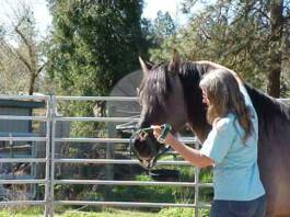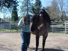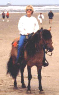 Erin Grey, (trainer/owner) and Sulphur's Chance getting his feet wet in the Pacific Ocean at Cannon Beach, Oregon